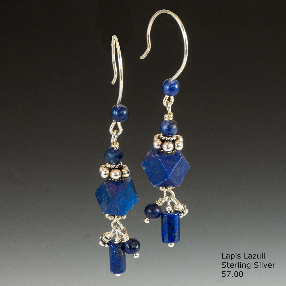 Beautiful Lapis Lazuli from Afghanistan is featured in these one of a kind Sterling and Fine Silver earrings handmade by me. To purchase, just call me at 256·287·0047.
