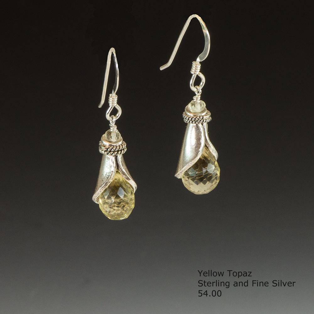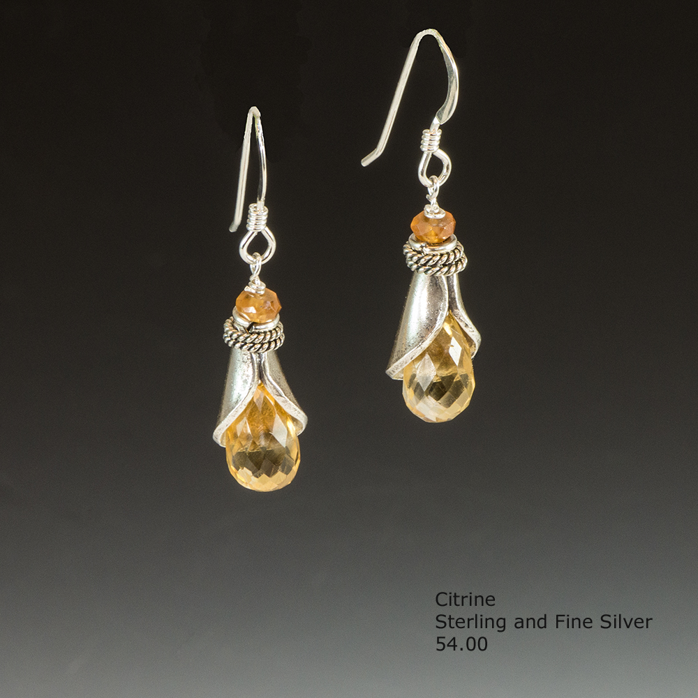 Citrine, Calcite, Garnet, Amber and Quartz are featured in these beautiful one of a kind Sterling and Fine Silver earrings handmade by me. To purchase, just call 256·287·0047.